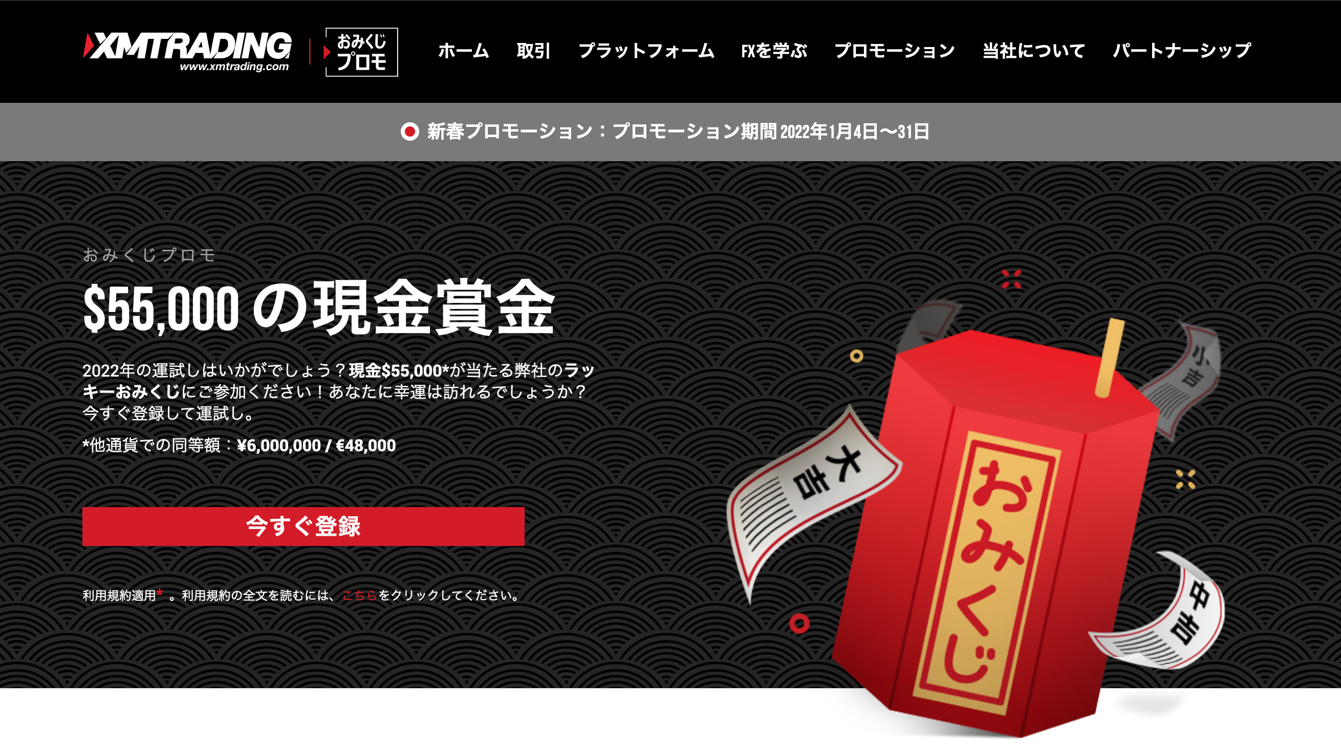 『XMTrading新春おみくじプロモ』では、ご参加頂いたお客様の中から抽選で100名のお客様に現金賞金が当たります。ラッキーくじにご当選されたお客様は、大吉、中吉、小吉の現金賞金をお取引口座で受け取ることができます。